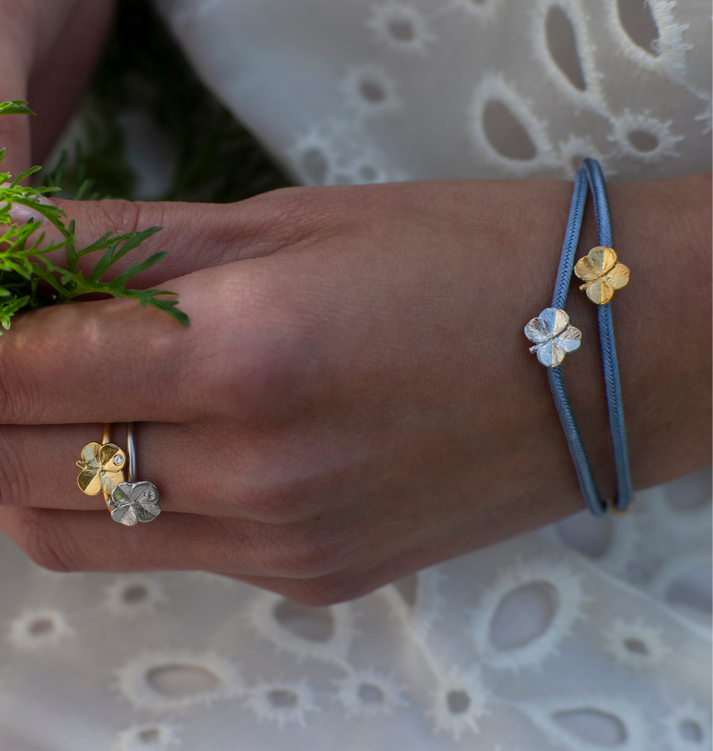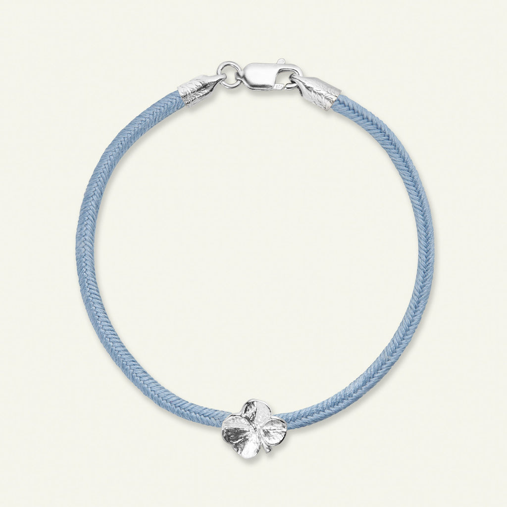 Flora Danicas firkløver kumihimo-silkearmbånd er laget av 100 % resirkulert sterlingsølv og belagt med 22 karat gull. Armbåndet er laget av 100 % japansk silke og håndlaget i Kyoto.