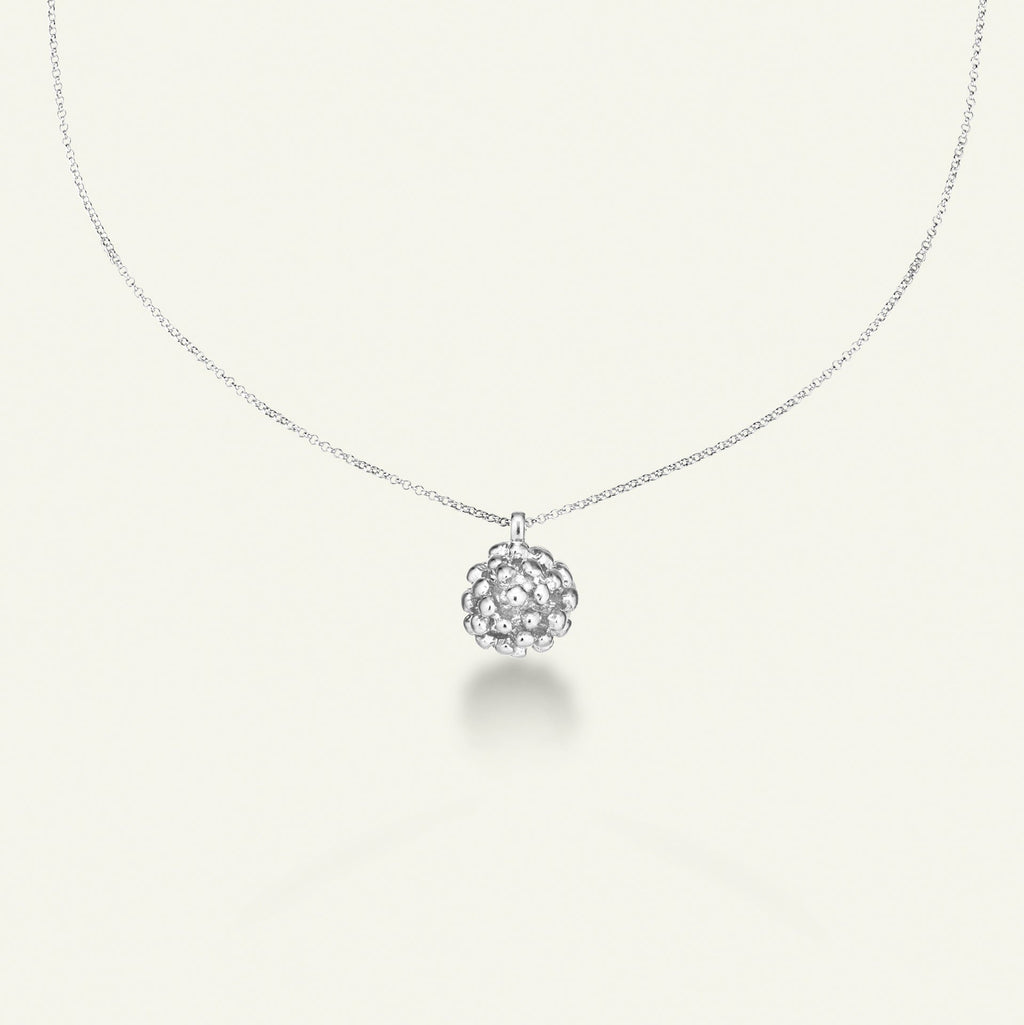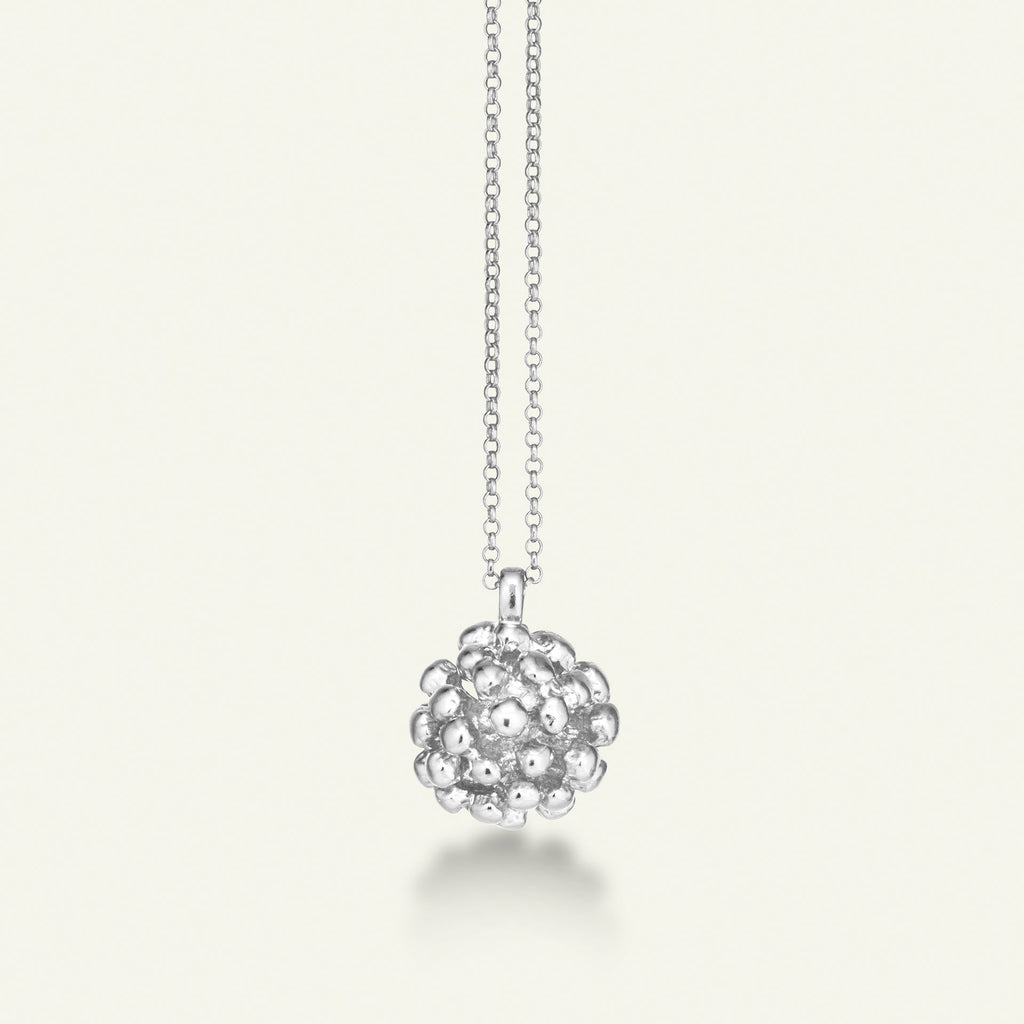 Enkel, elegant og unik. Dillblomsten som er brukt til dette anheng, er bevart akkurat slik naturen skapte den. Den opprinnelige strukturen og de fine detaljene i blomsten er vakkert bevart og gir et naturlig og unikt uttrykk. Anhenget henger på en elegant kjede som kan justeres i lengde (fra 40 til 45 cm). Både anheng og kjede er laget i 100 % resirkulert sterlingsølv belagt med rhodium.
