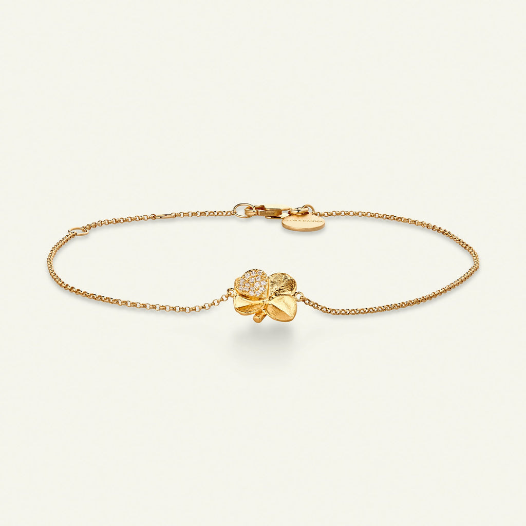 Det populære firkløver-armbåndet fra Flora Danica får et enda mer eksklusivt uttrykk i denne nye utgaven, hvor ett av bladene er prydet med 16 håndinnfattede zirkoner. De glitrende stenene tilfører dybde og lys til designet og gjør armbåndet til et markant og elegant statement.