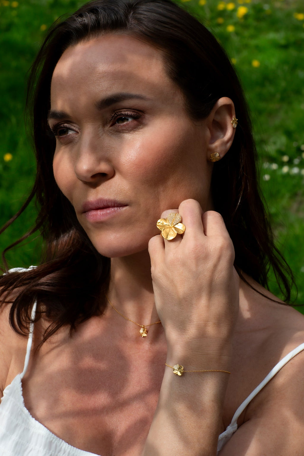 Armbåndet, med justerbar kjede (16, 18 og 19 cm), er håndlaget i høy kvalitet og skapt med dyp respekt for miljø og bærekraft – både i produksjon og materialvalg. Det er laget av 100 % resirkulert sterlingsølv med 22 karat forgylling og utsmykket med 16 håndinnfattede zirkoner, hver på 0,8 mm. Firkløveren måler 8,5 x 10,45 mm.