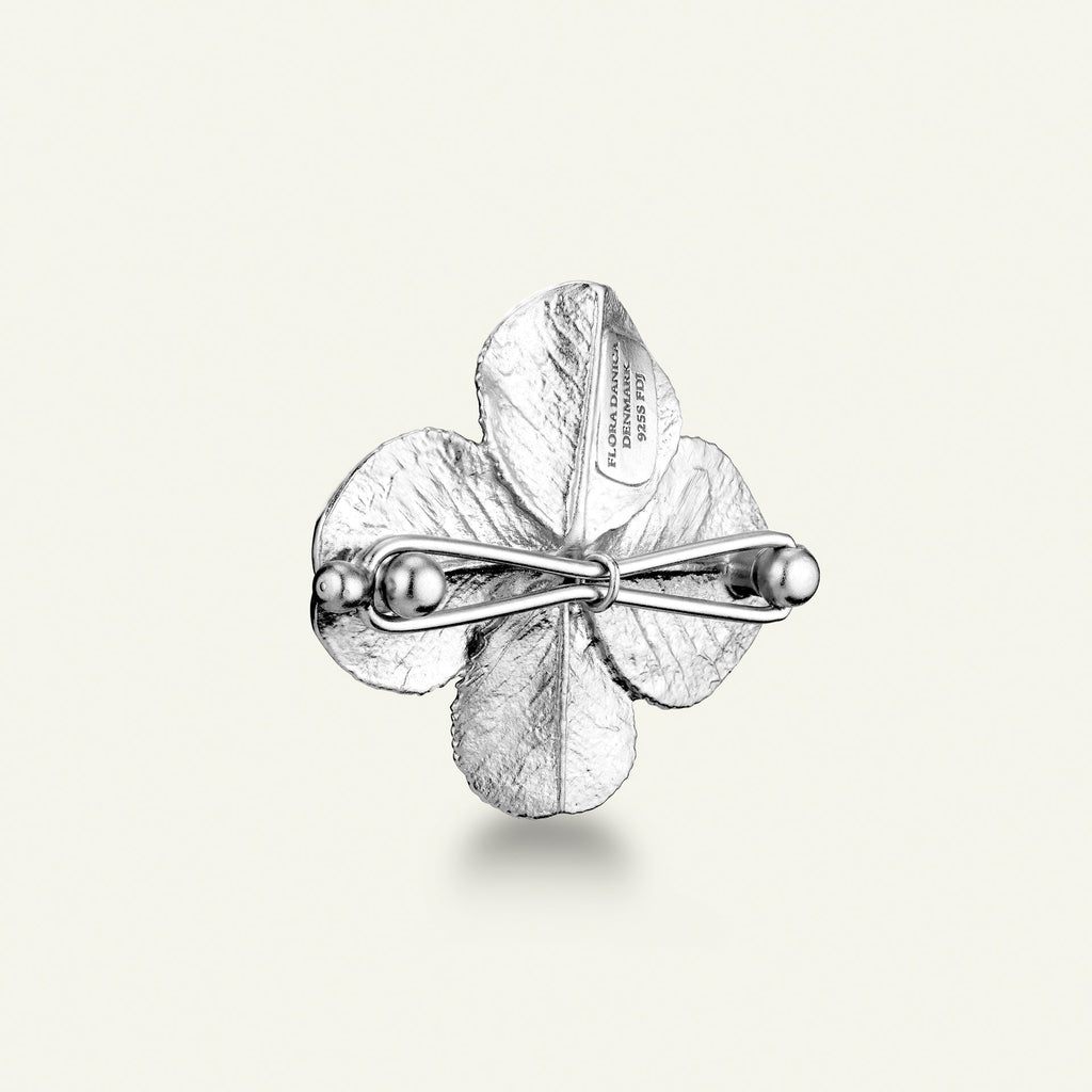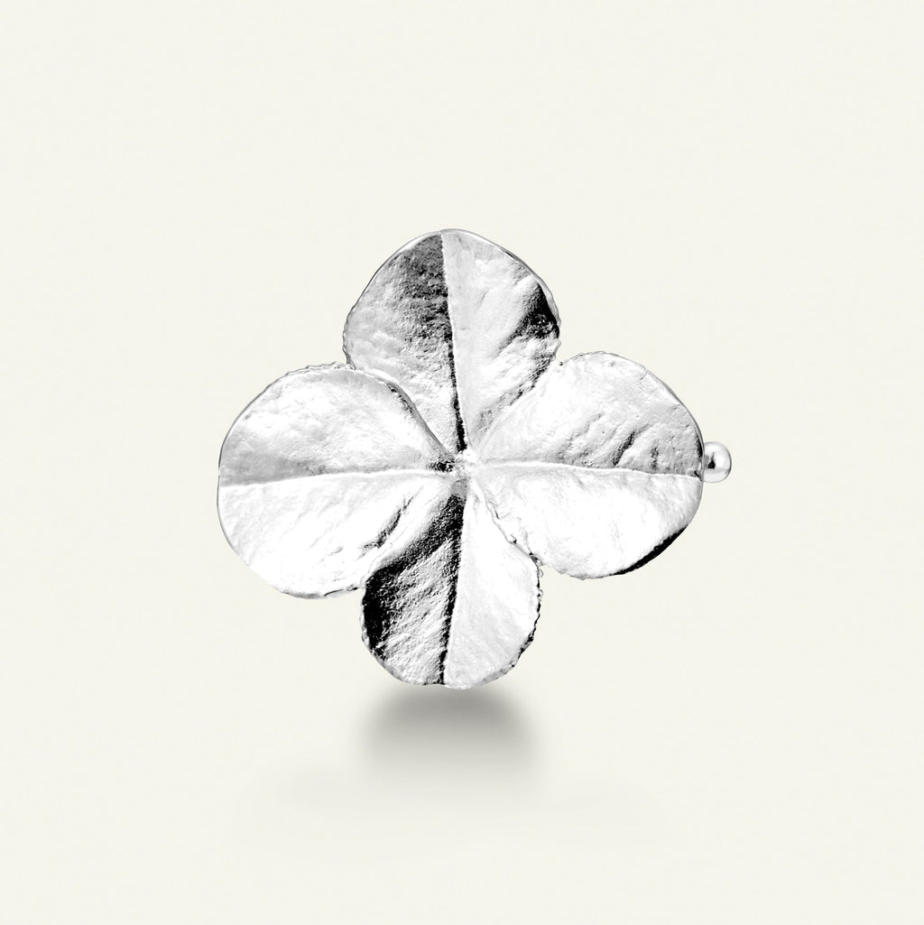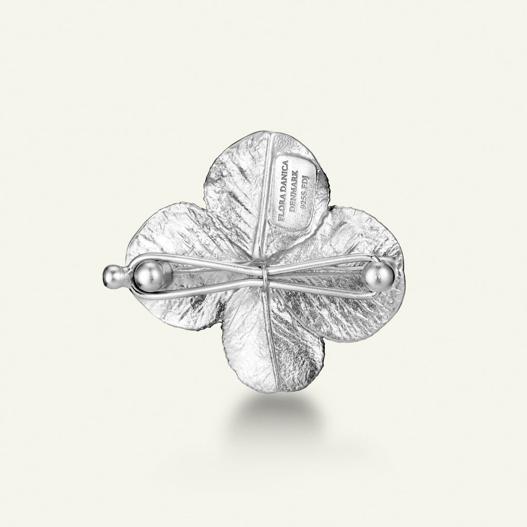 Den nye firkløver-hårklemmen er håndlaget i 100 % resirkulert sterlingsølv og belagt med rhodium for en varig og strålende glans.