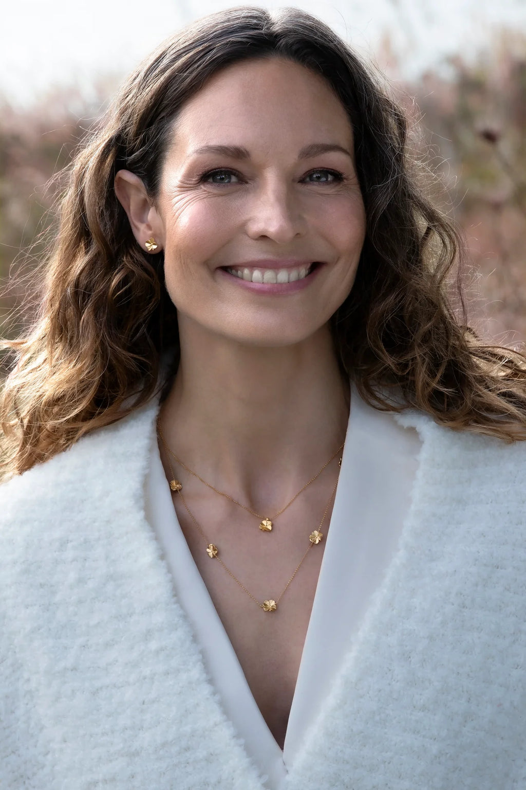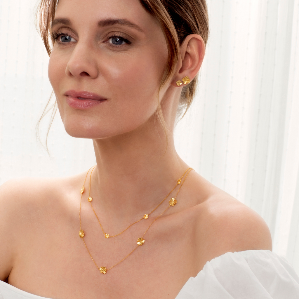 Anheng og kjede er laget av det fineste 100 % resirkulerte sterlingsølv med bærekraftig 22 karat forgylling. Firkløvernes høyde er 8,5 mm og bredden 9,1 mm. Den justerbare kjeden kan enkelt endres fra 50 cm til enten 55 cm eller 60 cm.