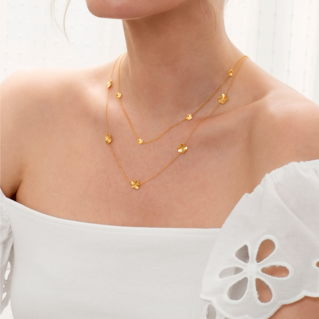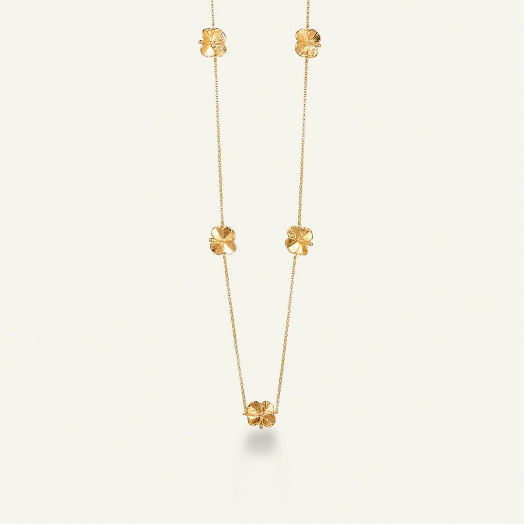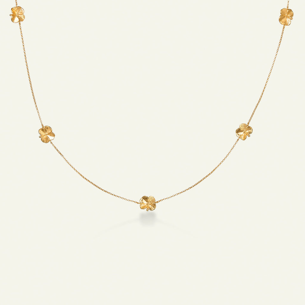 Firkløver halskæde med fem forgyldte kløvere, forgyldt