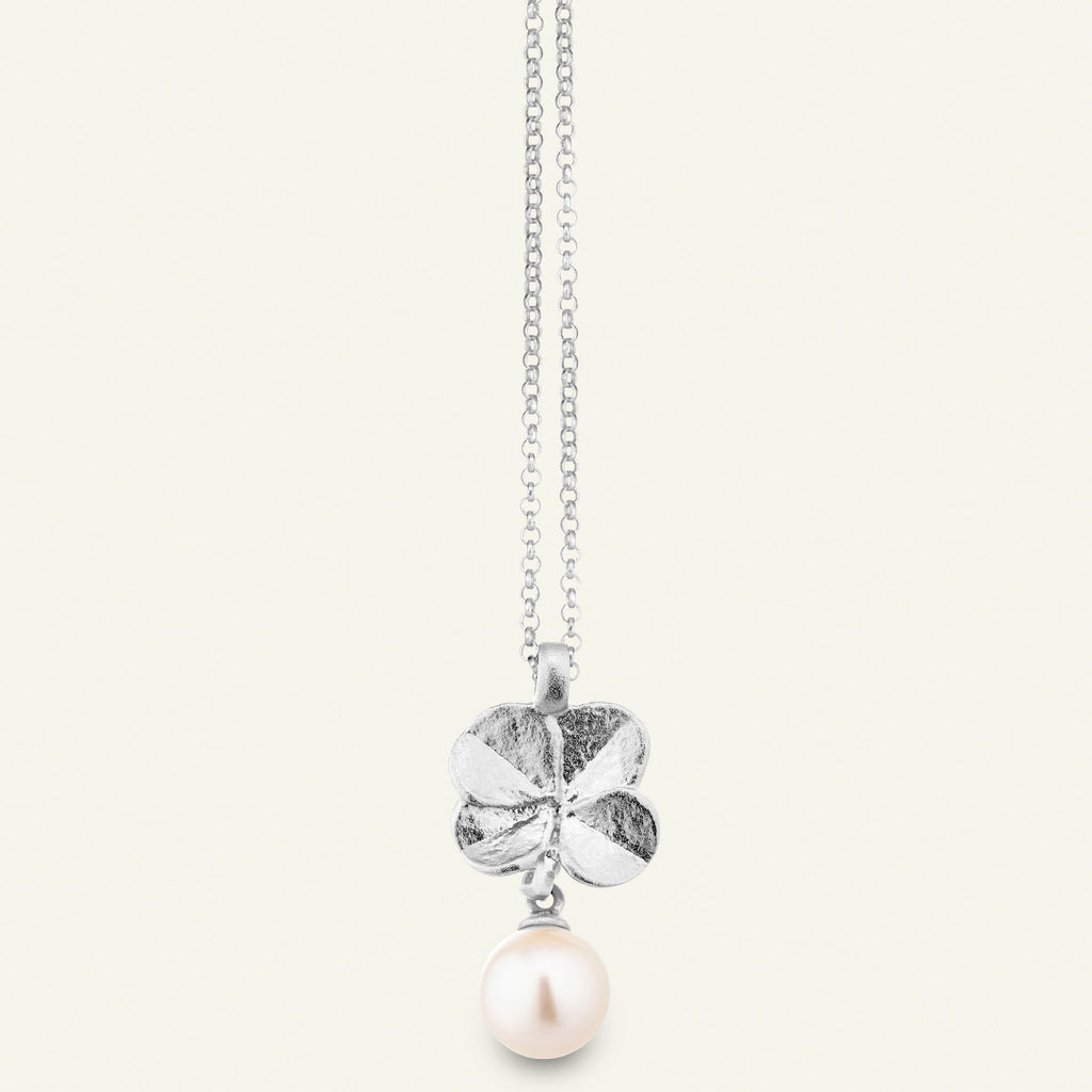 Anheng og kjede er laget av det fineste 100 % resirkulerte sterlingsølv, belagt med rhodium. Firkløverens fine detaljer er nøye bevart, og perlen tilfører et ekstra preg av eksklusivitet.