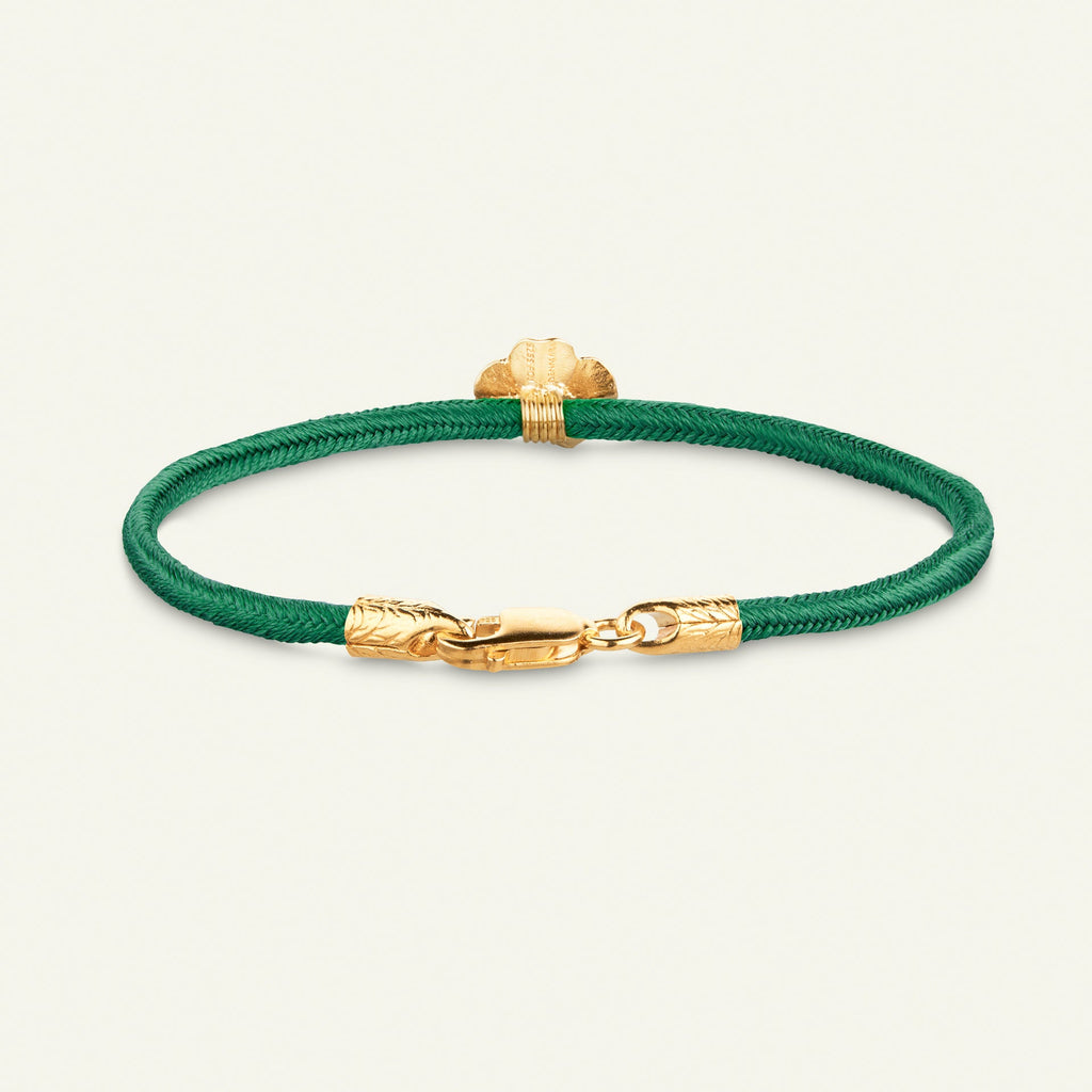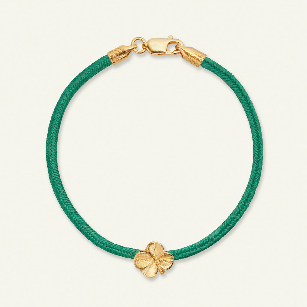 Flora Danicas firkløver kumihimo-silkearmbånd er laget av 100 % resirkulert sterlingsølv og belagt med 22 karat gull. Armbåndet er håndlaget i 100 % japansk silke fra Kyoto.