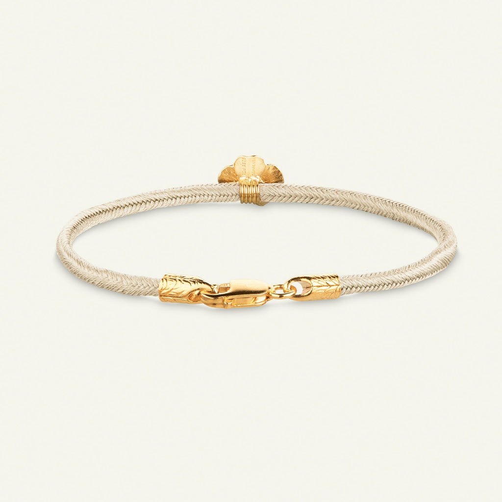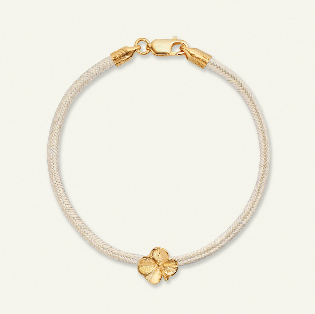 Flora Danicas firkløver kumihimo-silkearmbånd er laget av 100 % resirkulert sterlingsølv og belagt med 22 karat gull. Armbåndet er håndlaget i 100 % japansk silke fra Kyoto.
