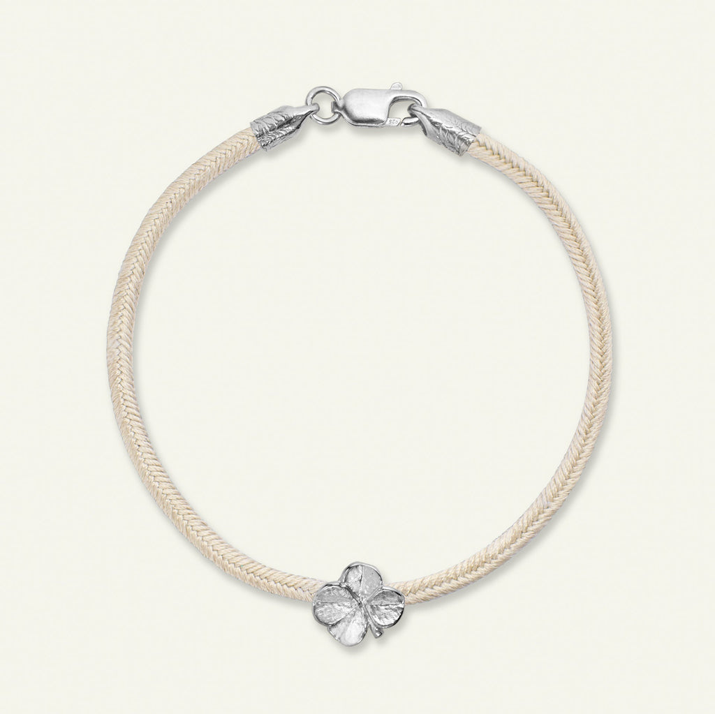 Flora Danicas firkløver kumihimo-silkearmbånd er laget av 100 % resirkulert sterlingsølv. Armbåndet er håndlaget i 100 % japansk silke fra Kyoto.