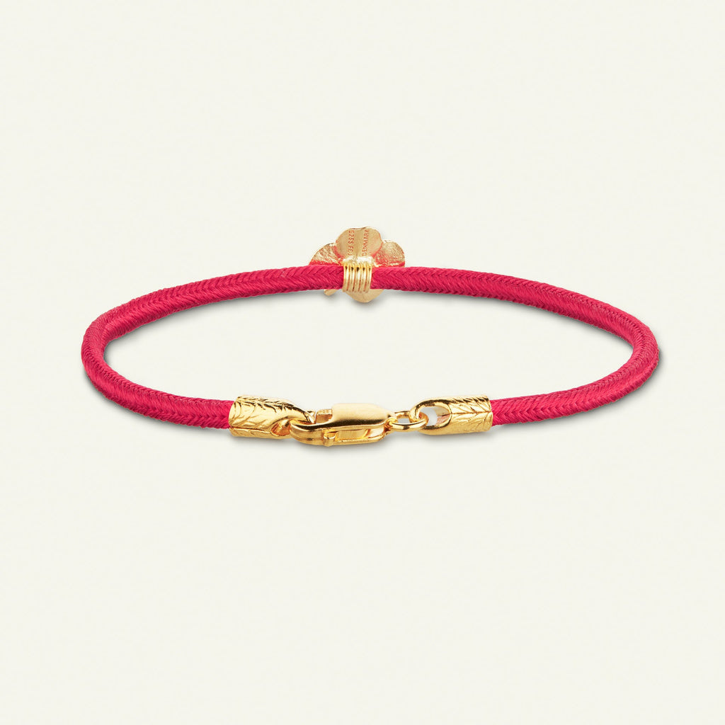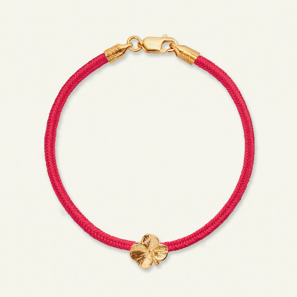 Flora Danicas firkløver kumihimo-silkearmbånd er laget av 100 % resirkulert sterlingsølv og belagt med 22 karat gull. Armbåndet er laget av 100 % japansk silke og håndlaget i Kyoto.