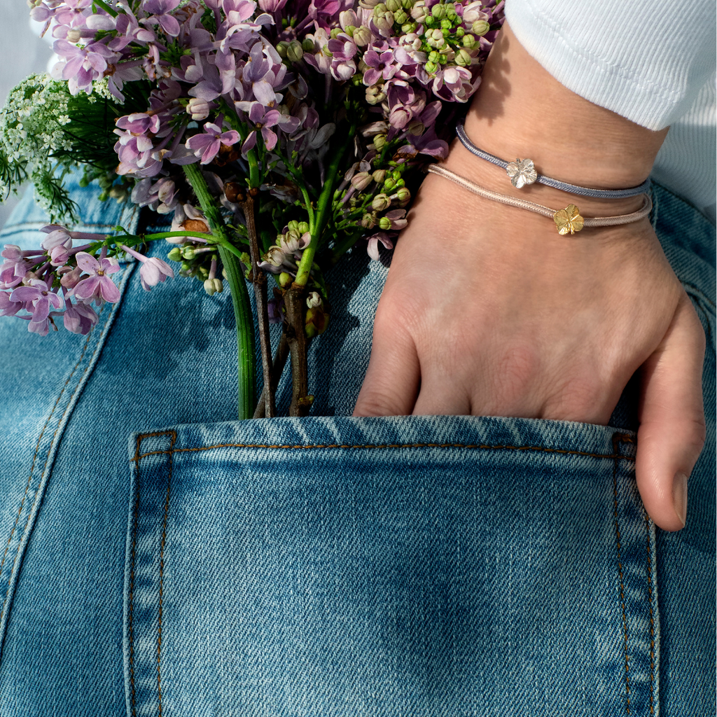 Flora Danicas firkløver kumihimo-silkearmbånd er laget av 100 % resirkulert sterlingsølv og belagt med 22 karat gull. Armbåndet er laget av 100 % japansk silke og håndlaget i Kyoto.