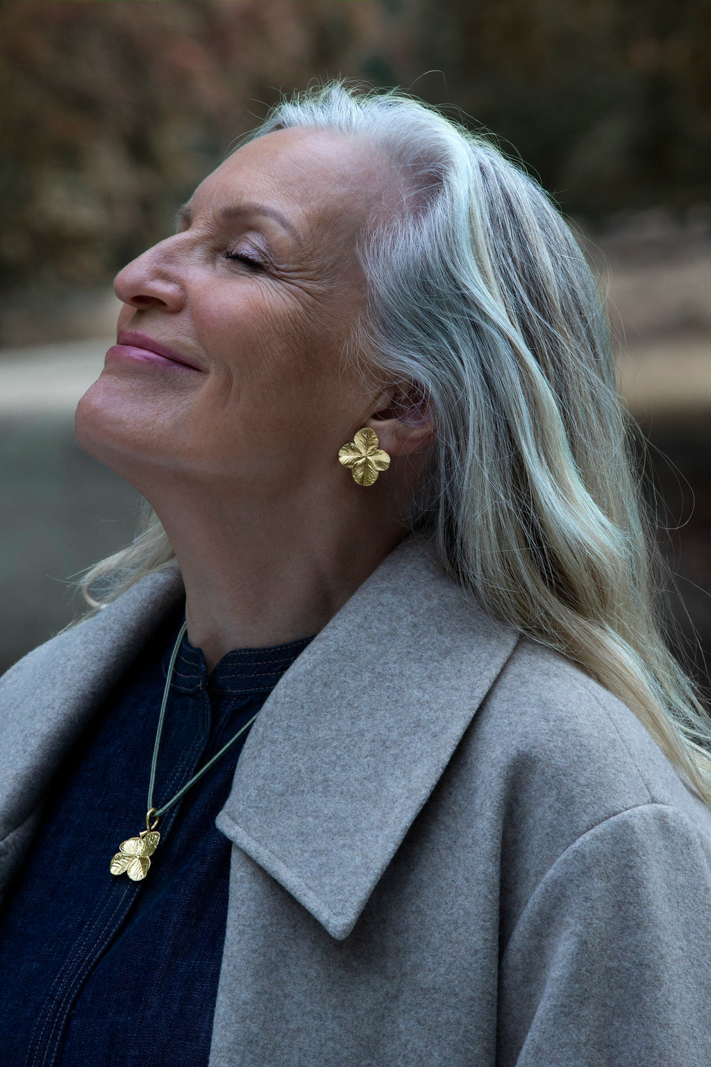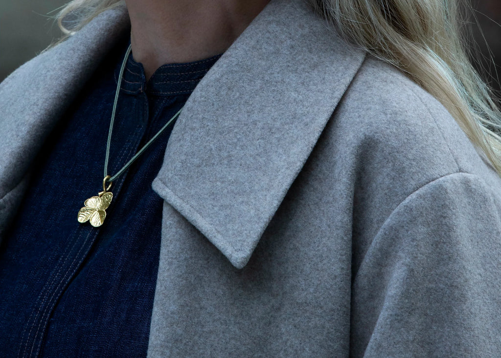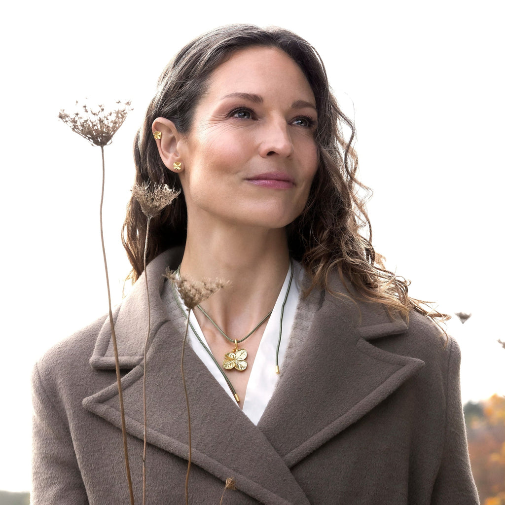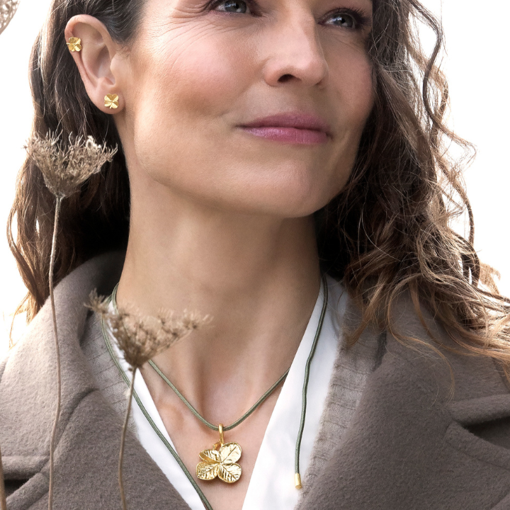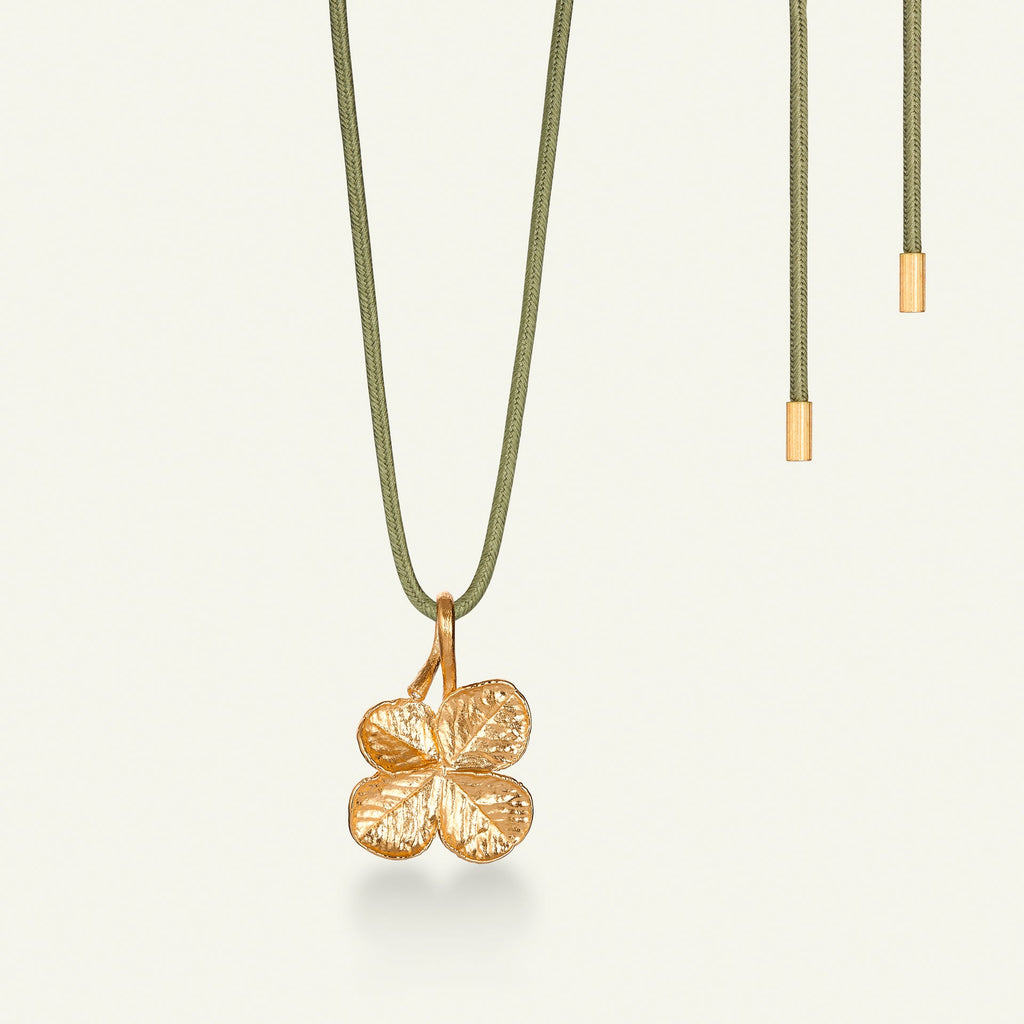 Firkløveren måler 3,8 x 2,8 cm og er håndlaget i høy kvalitet med dyp respekt for miljø og bærekraft – både i produksjon og materialvalg. Den er laget av 100 % resirkulert sterlingsølv og belagt med 22 karat bærekraftig, resirkulert gull. Snoren måler 120 cm og er håndlaget i Kyoto, Japan, av 100 % japansk silke.