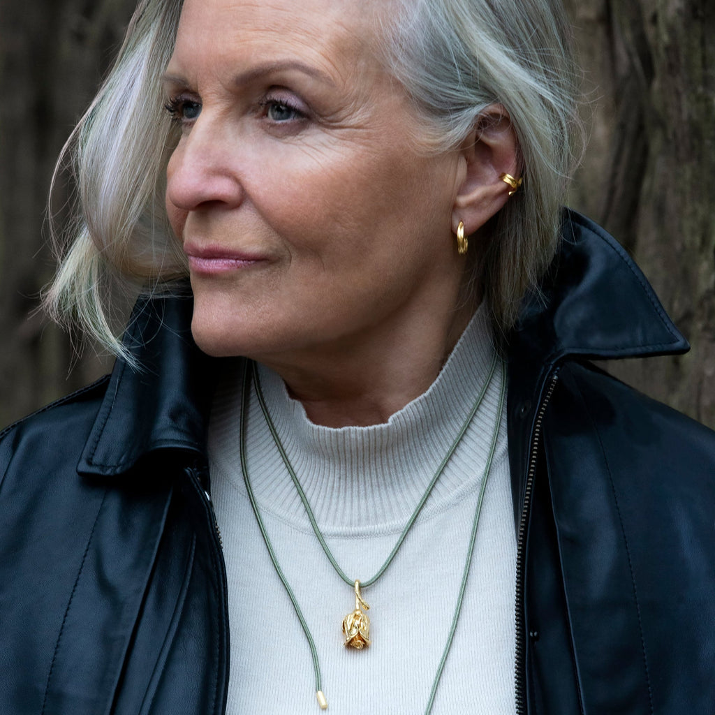 Gress ear cuff finnes i enten 22 karat forgylt sterlingsølv eller i sterlingsølv med et lag av rhodium som sikrer den fineste glansen og holdbarheten.