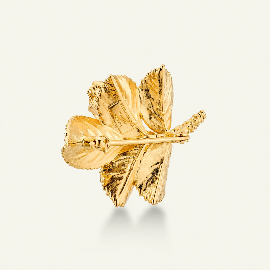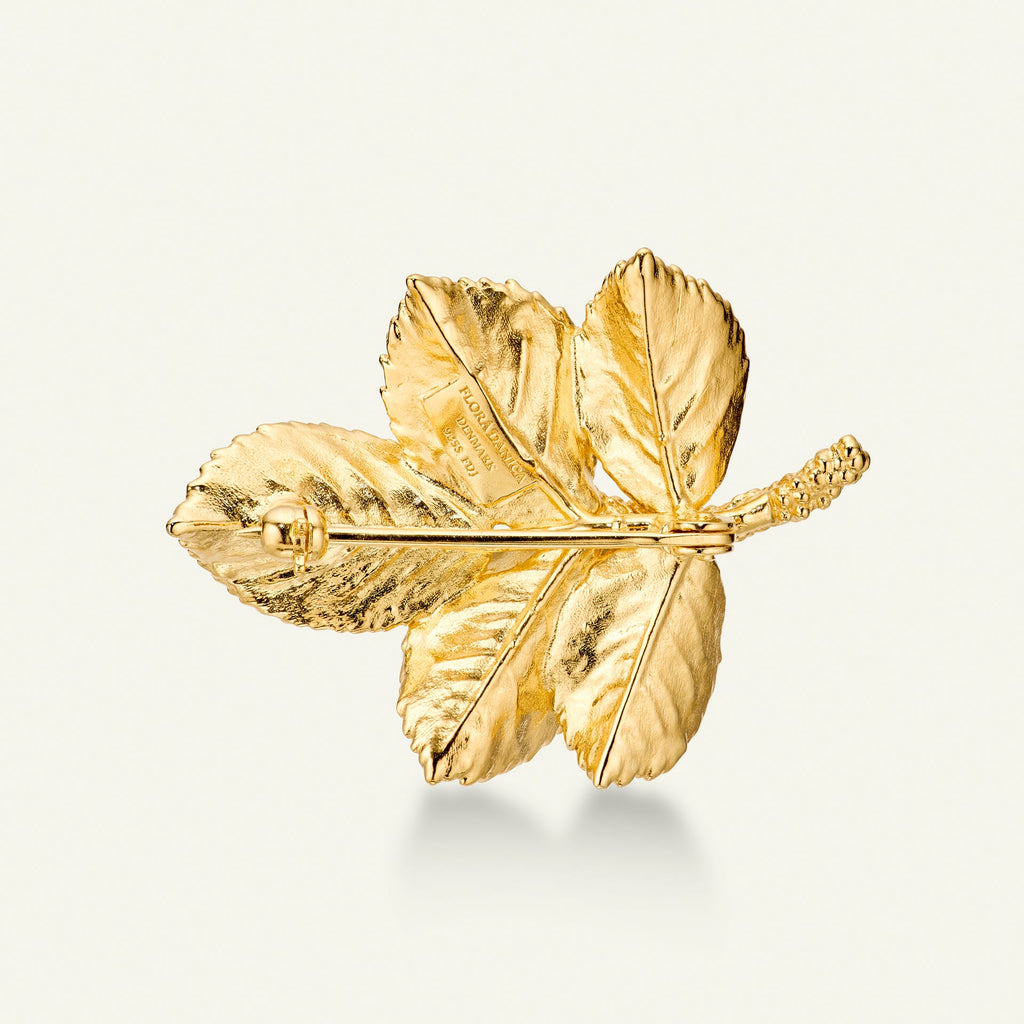 Brosjen er formet etter et ekte roseblad med en spirende roseknopp, bevart i Flora Danicas historiske arkiver og gjenskapt i de fineste materialer med dyp respekt for naturens delikate detaljer. De lett buede bladene, den naturlige strukturen og det livlige skuddet gir et uttrykk av både styrke og eleganse.
