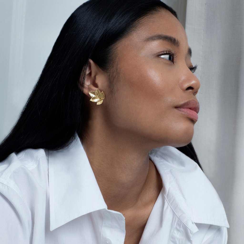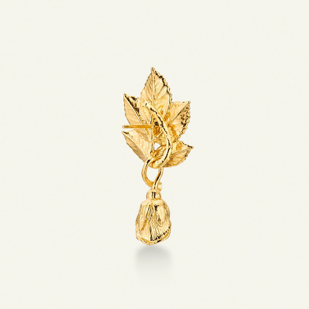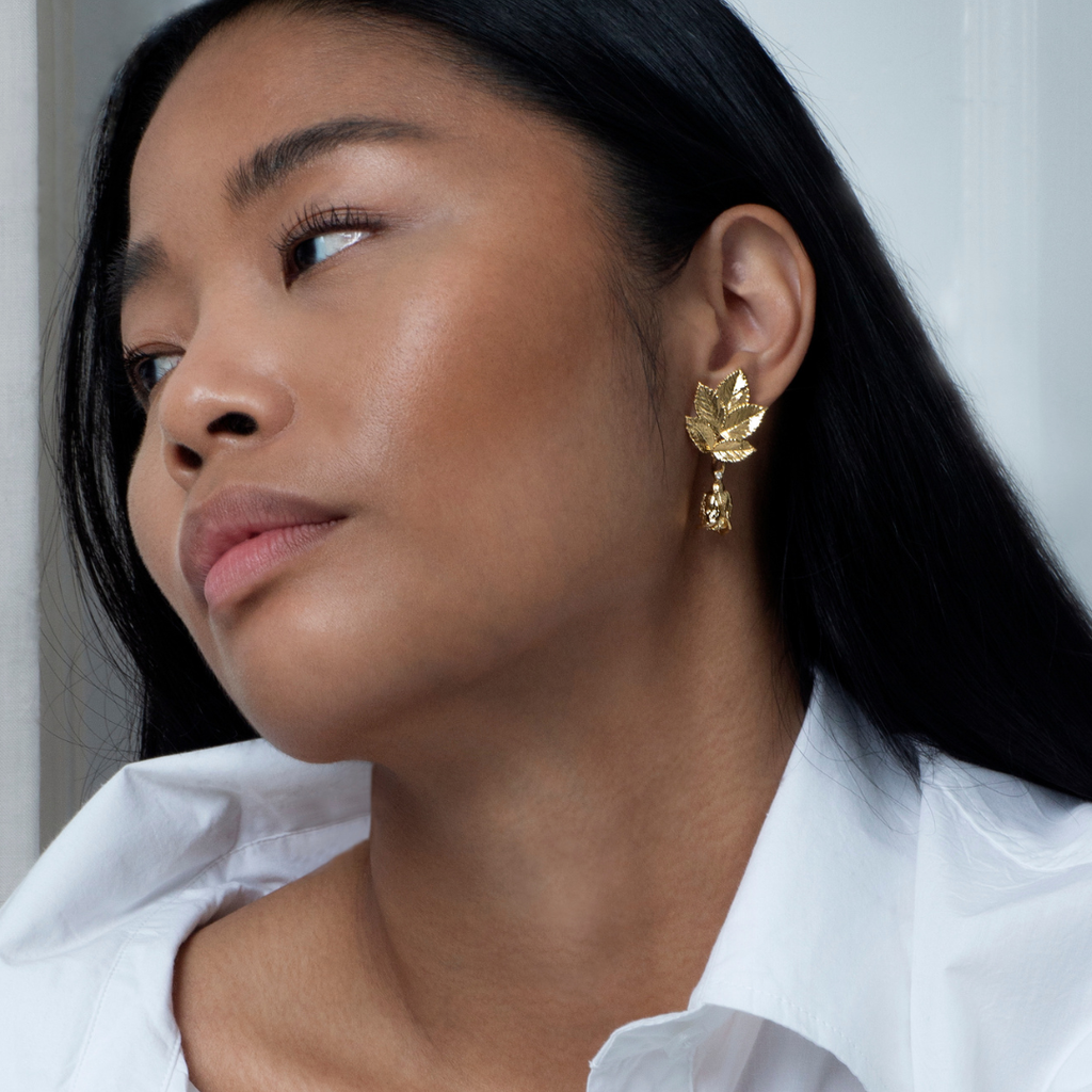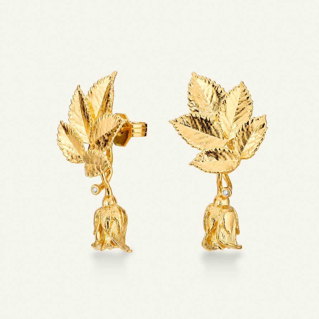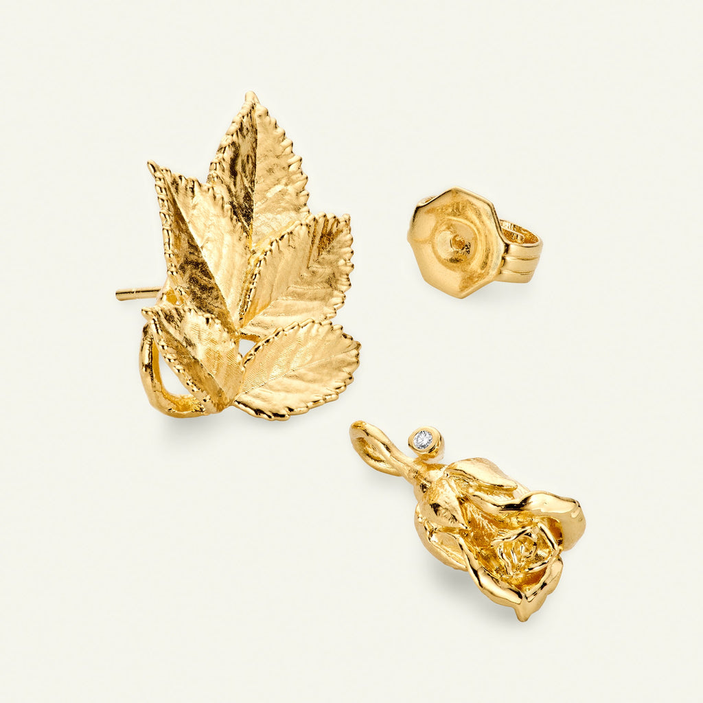 Hver ørering er formet etter et ekte roseblad, bevart i Flora Danicas historiske arkiver og gjenskapt i forgylt sterlingsølv med største respekt for naturens detaljer. Fra rosebladet henger en liten rose, der en klar, glitrende diamant sitter i stilken og tilfører et diskret preg av eksklusivitet.