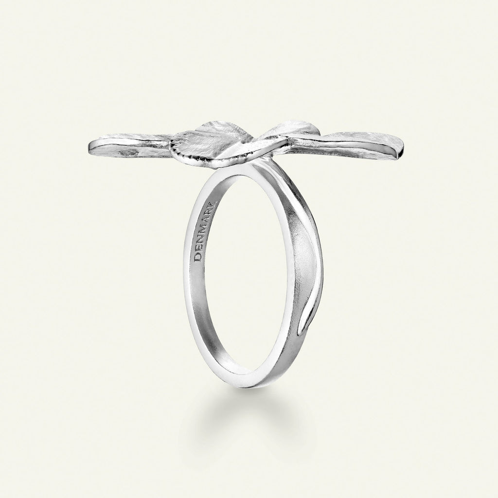 Ringen er laget i sterlingsølv belagt med rhodium. Ser du nøye etter, vil du finne en glitrende zirkon på det ene bladet.